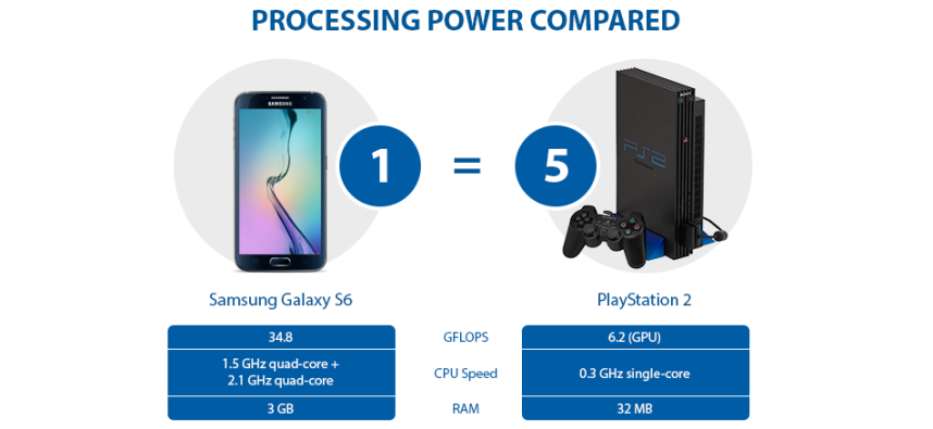 Take an everyday item that we all use today, such as a mobile phone, to be precise a Samsung Galaxy S6. The processing power of an S6 is approximately equivalent to 5 x Sony PlayStation 2 consoles in terms of performance.