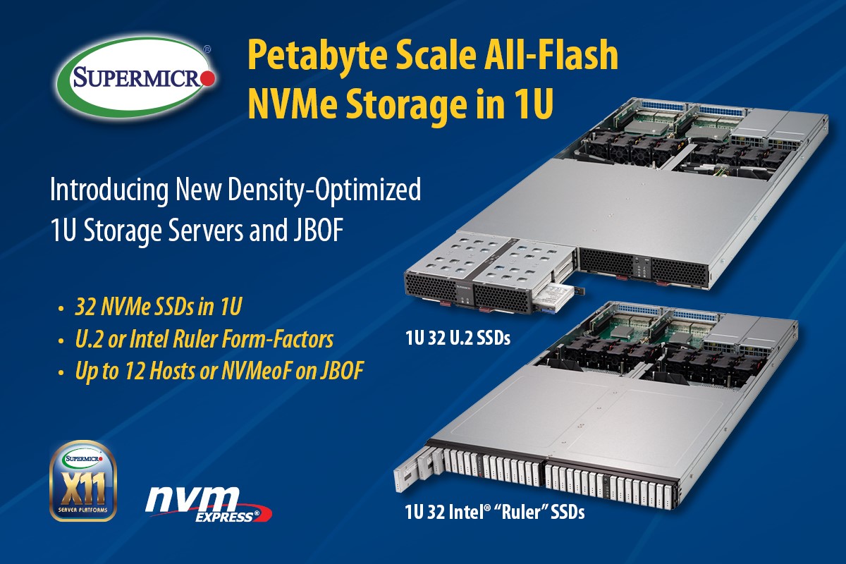Charles Liang, President and CEO of Supermicro says; "With Supermicro 3.0, our enterprise customers benefit from the industry’s broadest selection of first-to-market server and storage systems with global reach, premium quality, RAS security, rack scale management and global services, and our new all-flash 32 hot-swap drives in a high-density 1U system design is the latest example of how Supermicro continues to lead the way for NVMe technology. With more than triple the all-flash storage density of previous 1U solutions, this Supermicro system will take us to Petabyte scale in a single 1U system in the near future. This new JBOF supports flexible configurations with up to twelve hosts or head nodes and extremely high data transfer throughput up to 64GB per second.”