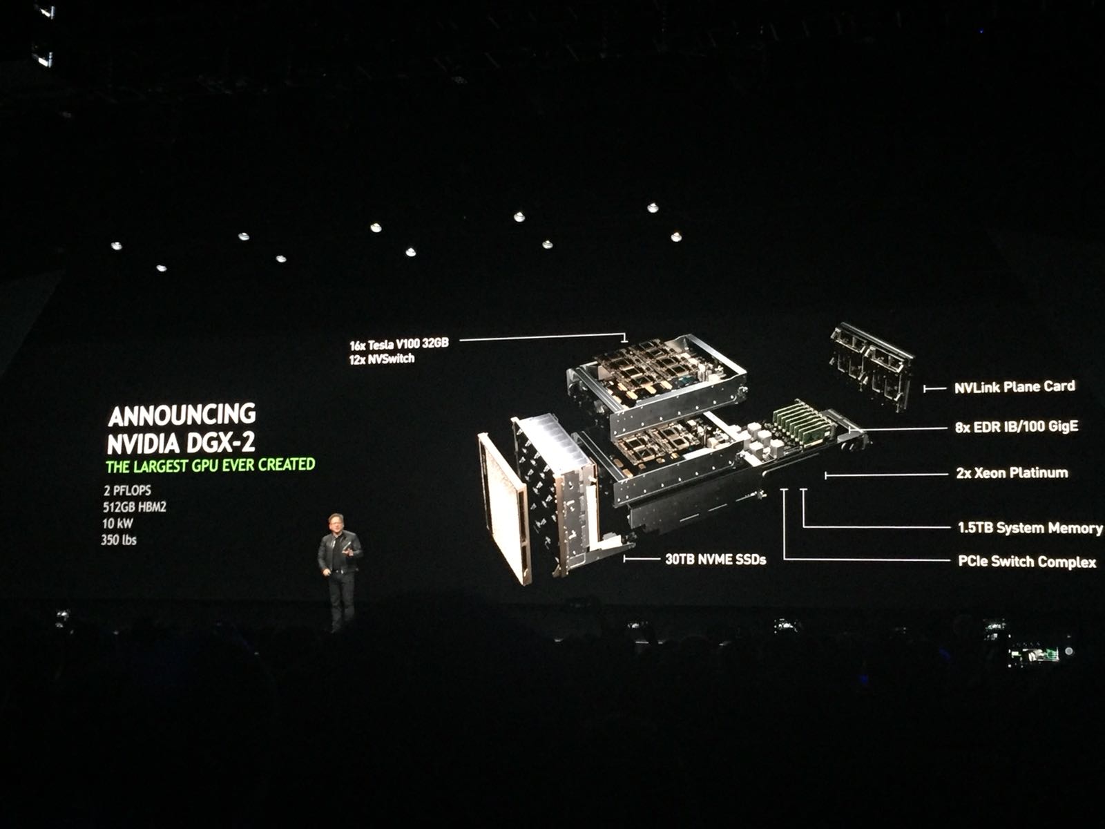 DGX-2, the first 2 petaFLOP deep learning system, delivers 10X performance gain, driven by the new Tesla V100 32GB GPU and NVSwitch.