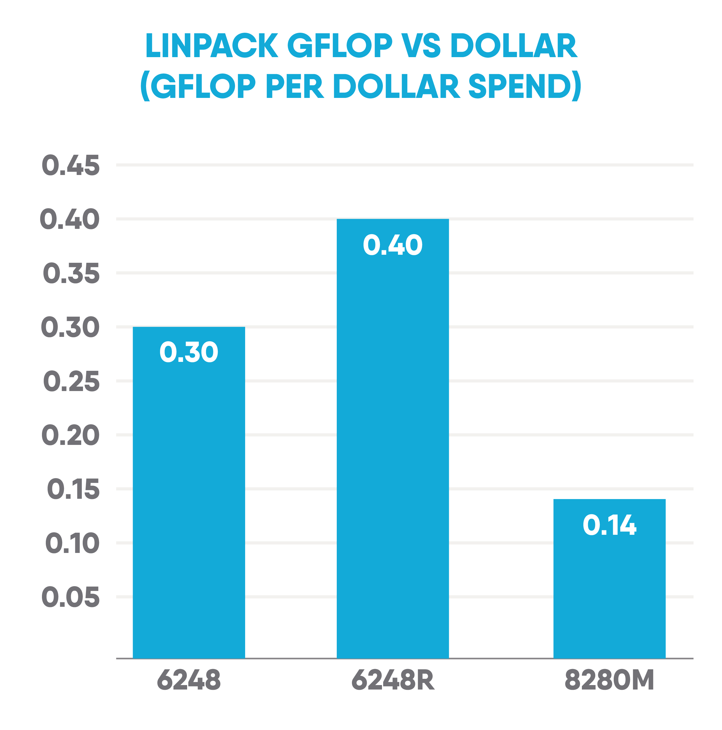 More importantly, as mentioned in this blog already, Intel are being aggressive in their pricing for this refresh, the below table shows the LINPACK performance vs the dollar cost of the CPU’s. As you can see you get a lot more bang for your buck with the 6248R. It scores 0.4GFLOPs per dollar, this is a big jump when compared to the 6248 and a huge increase from the Platinum 8280M, which has a per CPU cost of $13012.