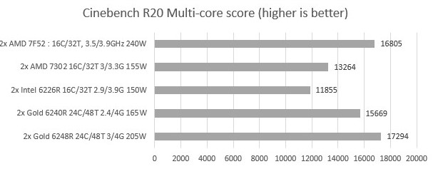 For the Cinebench multi core test (seen below), the AMD CPU punches above its weight and outperforms the same core/turbo 6226R and even the 6240R despite this sku having 8 extra cores per CPU. The 7F52 manages this with the higher base frequency and by allowing more cores to turbo at higher frequencies. The AMD EPYC 7302 also has 16 cores but the higher frequency of the 7F52 gives it the big advantage.