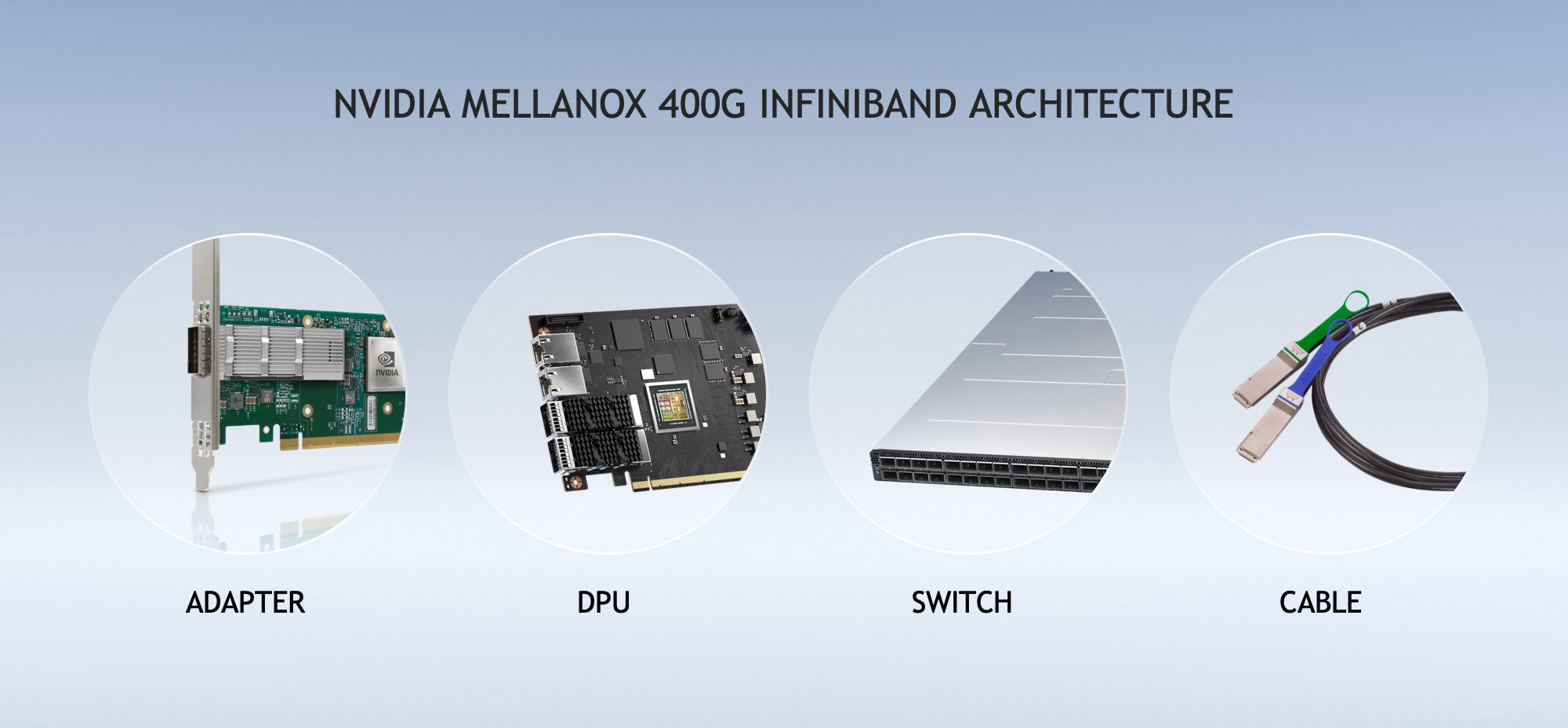 The seventh generation of Mellanox InfiniBand provides ultra-low latency and doubles data throughput with NDR 400Gb/s and adds new NVIDIA In-Network Computing engines to provide additional acceleration.