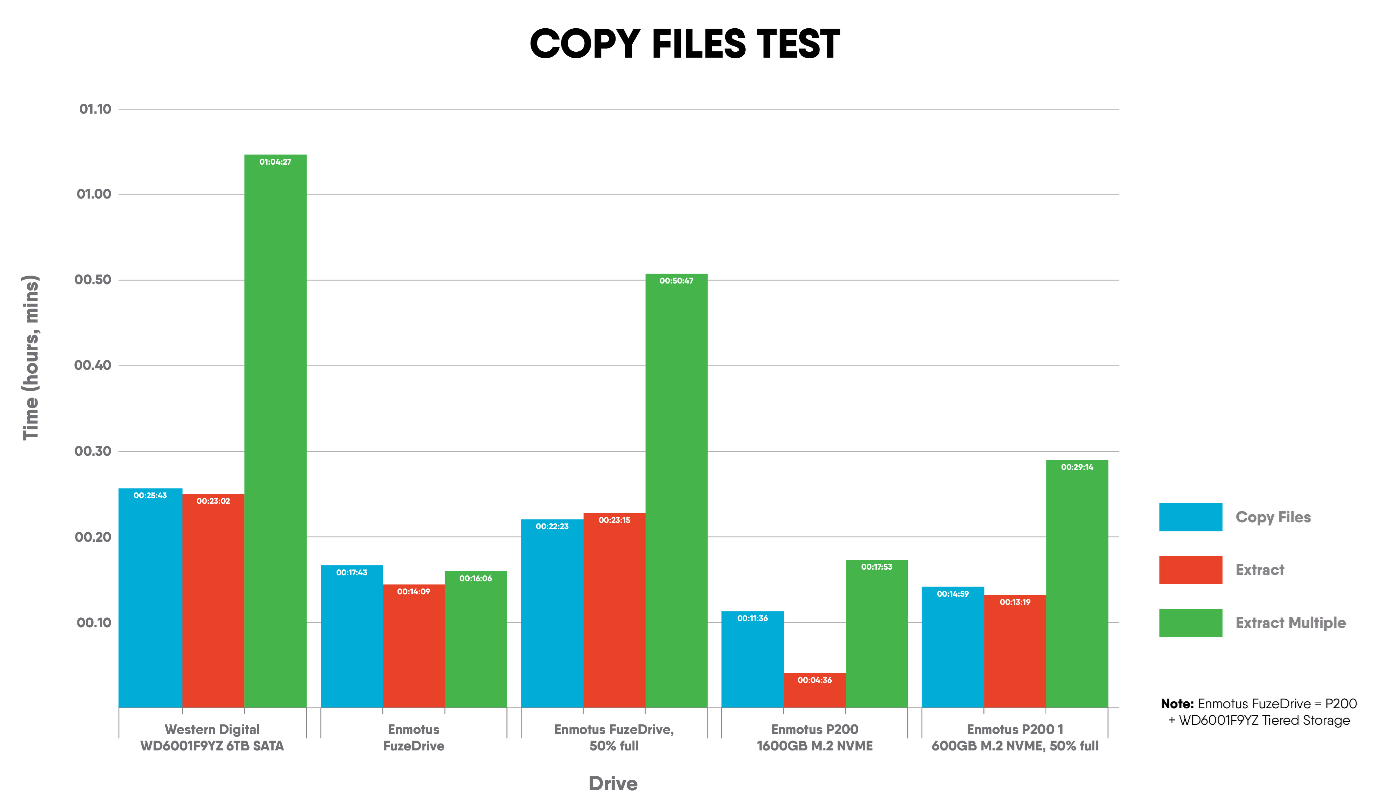 So, for our FuzeDrive we have the mechanical HDD and the Enmotus P200. From here on in when we refer to FuzeDrive we're speaking about these paired drives. For comparison we also tested the P200 NVMe on its own (without it being attached to any FuzeDrive), which will be made clear in the results below, and refered to as the P200. When we mention HDD we are referring to the 6TB Hard Drive.