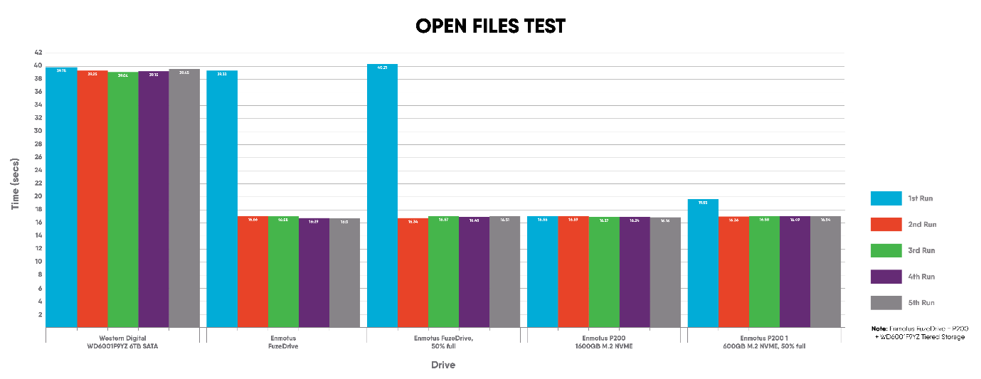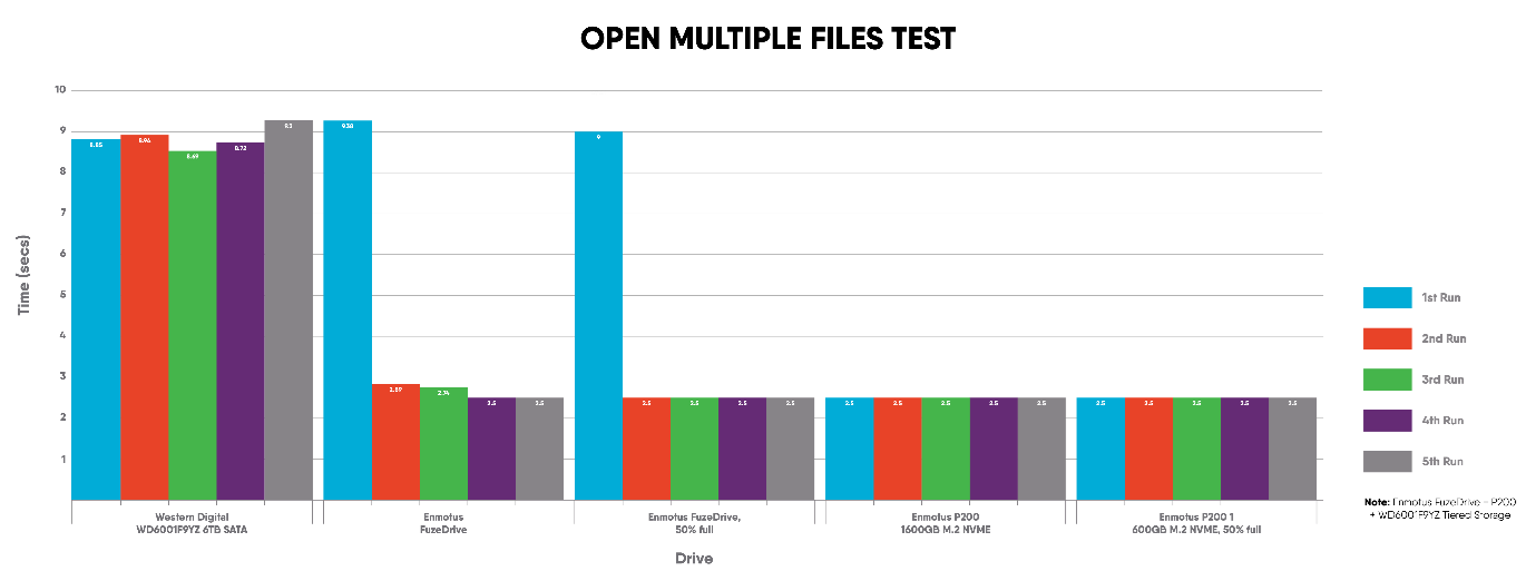 For this test we open the File2 in WinRAR and time how long it takes to open. This was run 5 times with a reboot in between to ensure RAM or any other caching wasn’t affecting results. Running 5 times allows FuzionX to move the data to the faster tier. We also leave a few minutes after the 1st run to allow the software to perform these tasks when testing Fuzedrive.