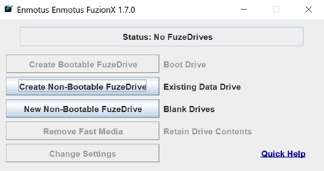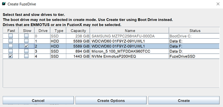 To create a FuzeDrive, Enmotus provide FuzionX software. It is a very simple process which we will outline below. You can create the FuzeDrive whilst retaining data on one of the existing drives or start with blank drives. As a caveat, only 1 drive can have data on it if you choose to retain existing data.