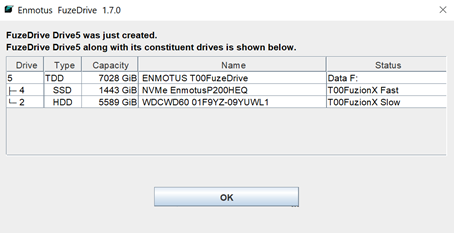 Finally, you get a summary screen showing some FuzeDrive information once the creation is complete.
