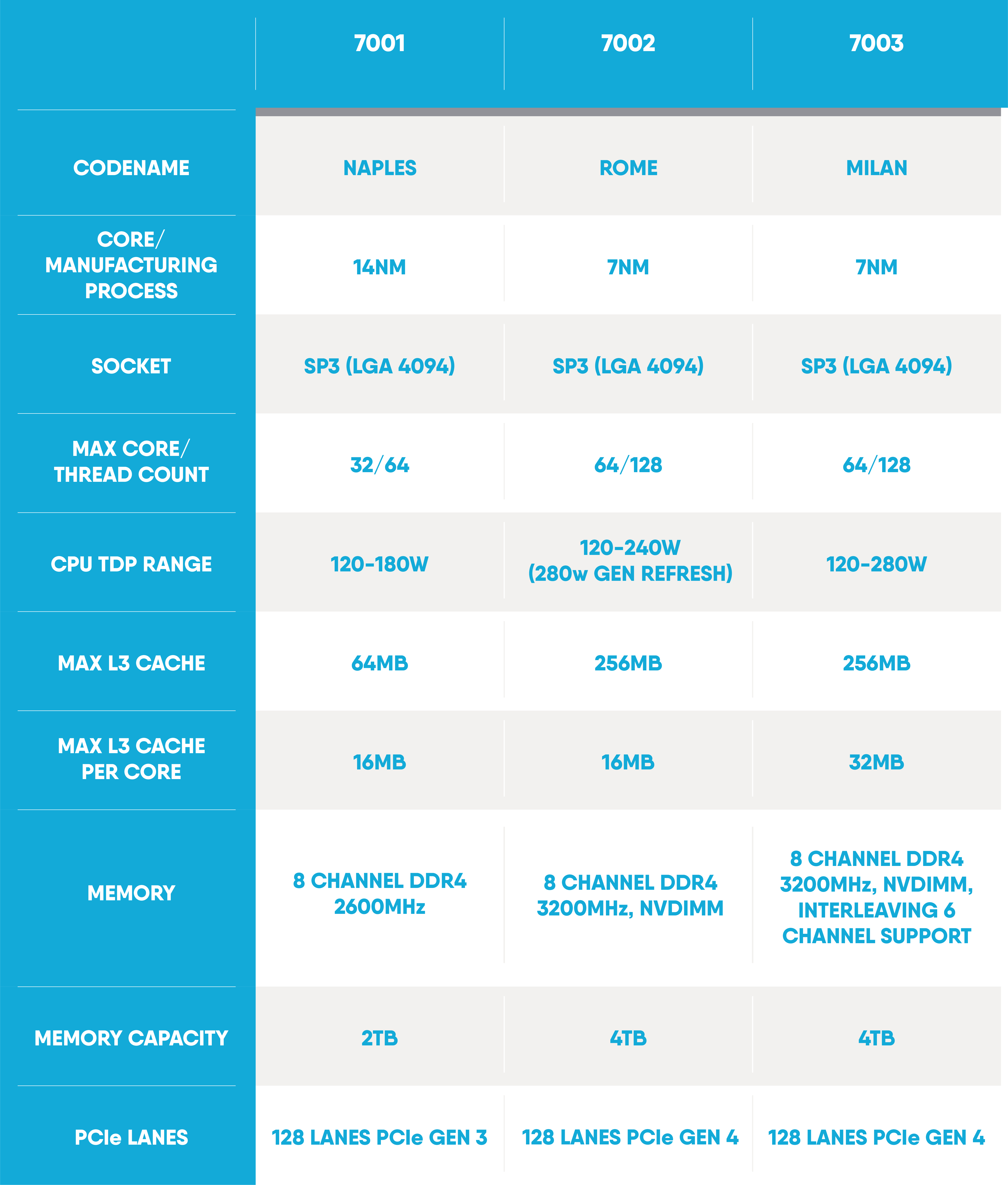 AMD use a 7xxx naming convention across SKUS. Naples line-up used a 7xx1 format, Rome followed suit with 7xx2 and the latest and greatest are the 7xx3 series. The infographic below shows how each SKU is named.