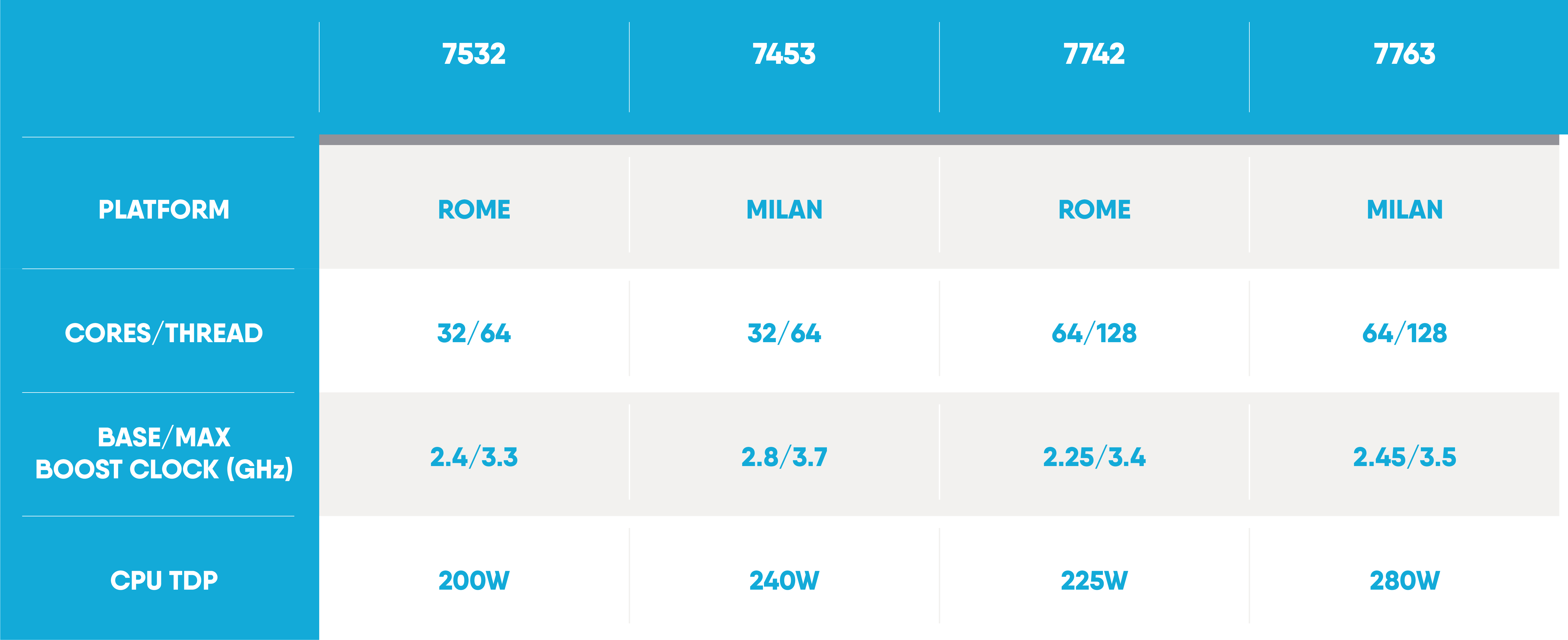 The Milan range still use the same Socket SP3 aka LGA-4094, this means there is no need to change server platform/motherboards when thinking about upgrades. If you have a platform that can support Rome then Milan will be no problem. All that will be needed is a BIOS update to support the new 7003 processors. The only upgrade path that isn’t possible is a 7001 based server to the newer 7003.