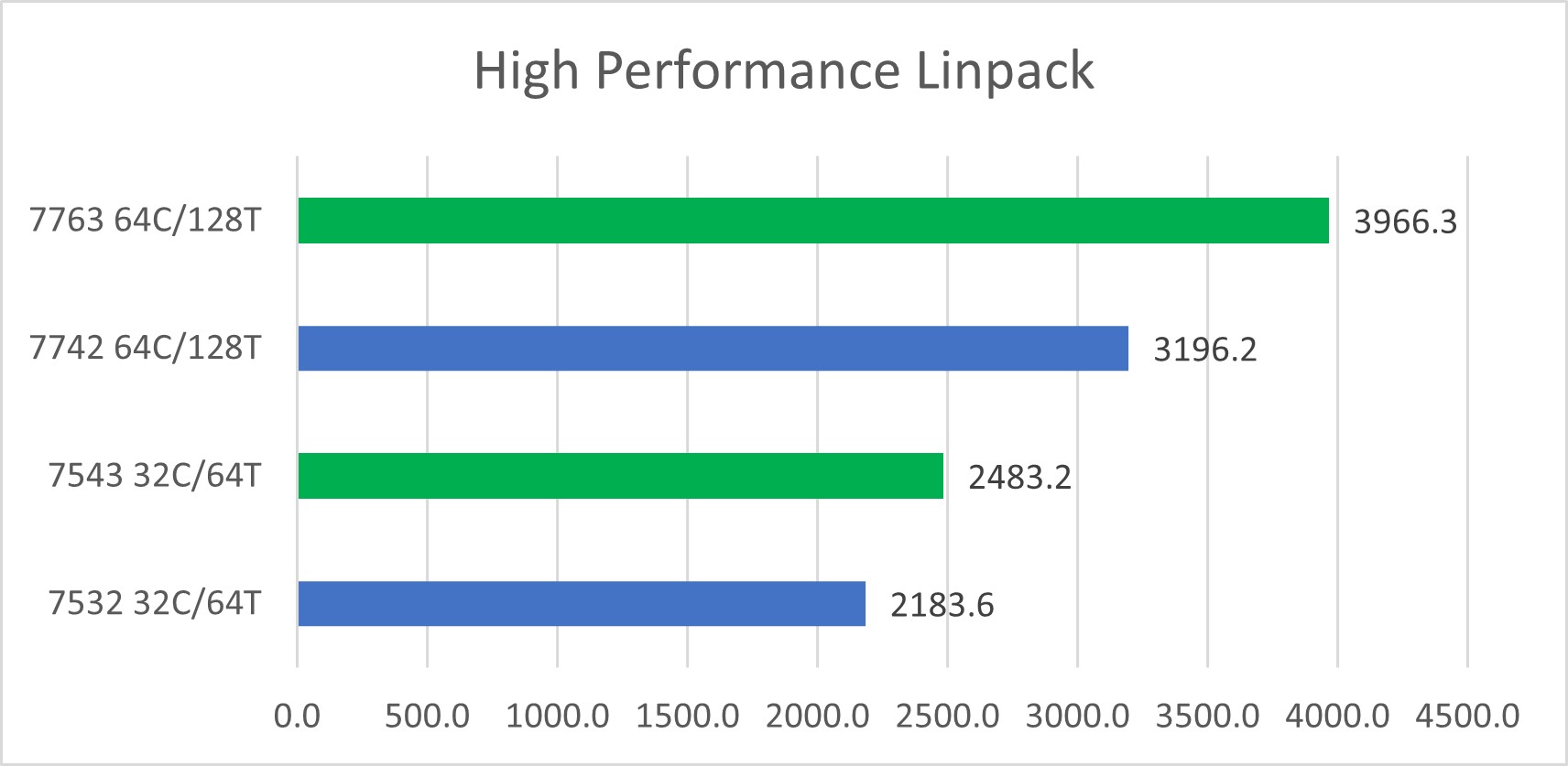 Finally, we take a look at High Performance Linpack which shows around a 25% performance leap going between the 64 core SKU’s and a more modest 15% increase on the 32 cores.