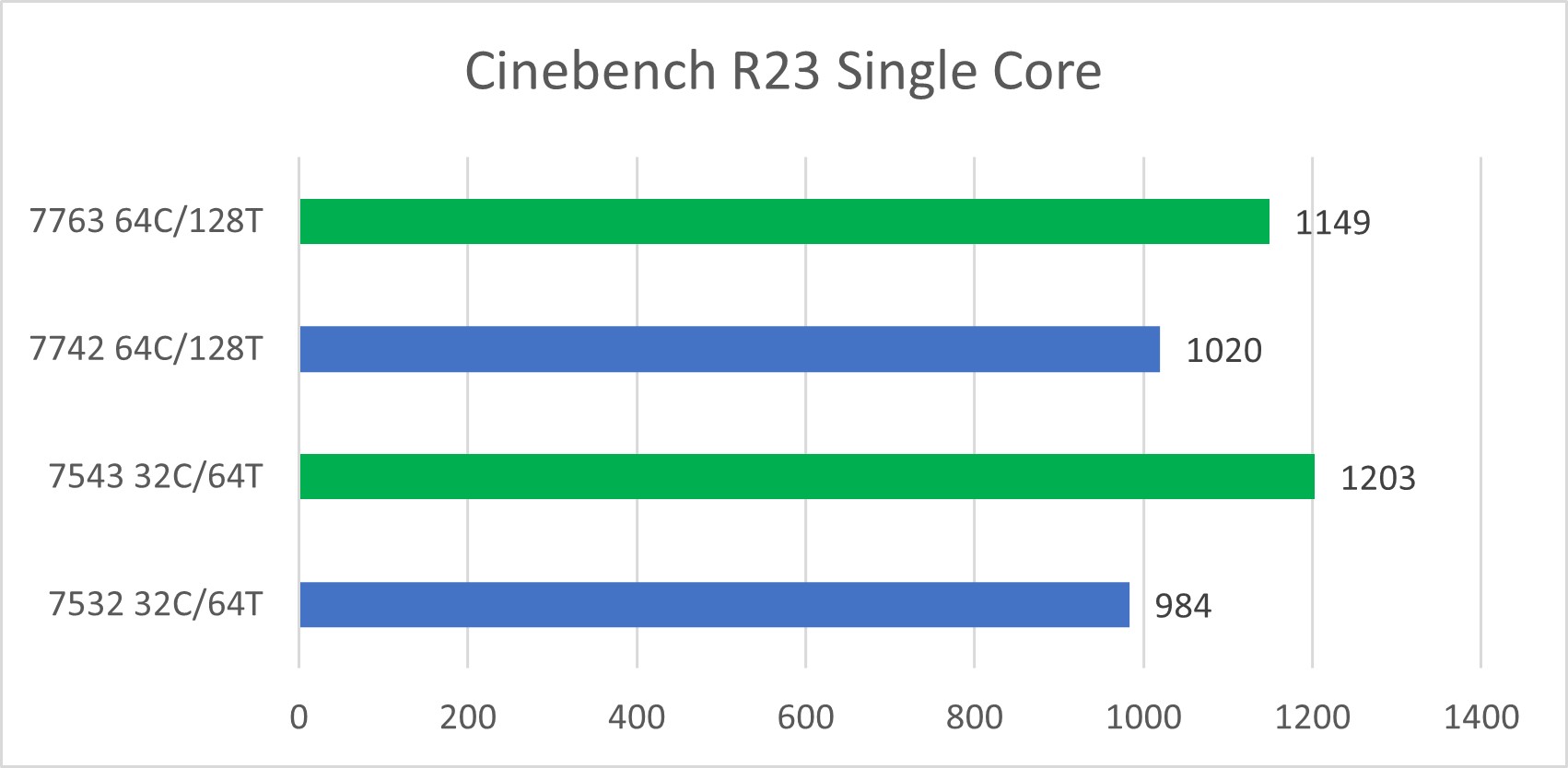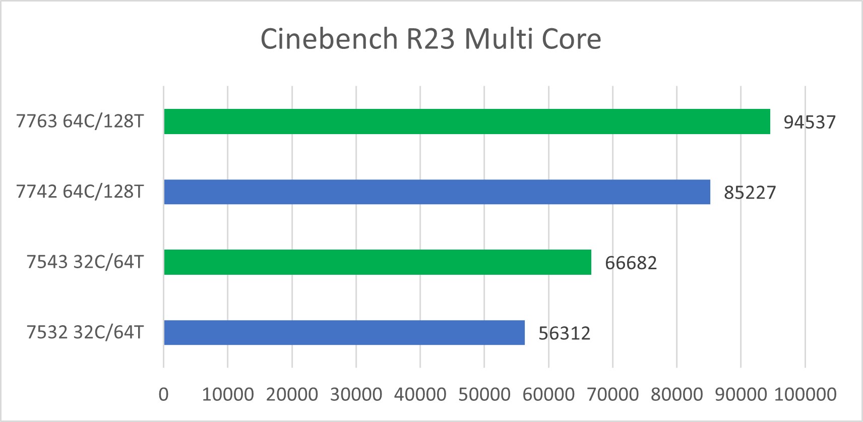 Starting with Cinebench R23, in the multi core test, the 7763 core leads out of the gate as expected and shows an increase of around 11% when compared to the Rome equivalent 7742. The single core benchmark shows similar results.