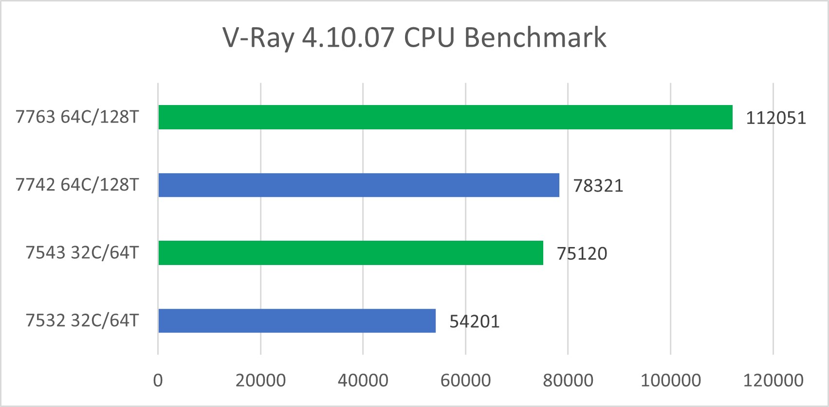 The V-Ray CPU benchmark uses CPUs for rendering a scene typically performed by GPUs. The benchmark, however, is tuned for CPUs to run such workloads and this test should scale well with more cores. In the results below we can see a significant increase in performance when transitioning from Rome to Milan. 78321 to 112051 is around a 42% increase so this is great performance! The 32 core 7543 also showing an increase of a similar level.