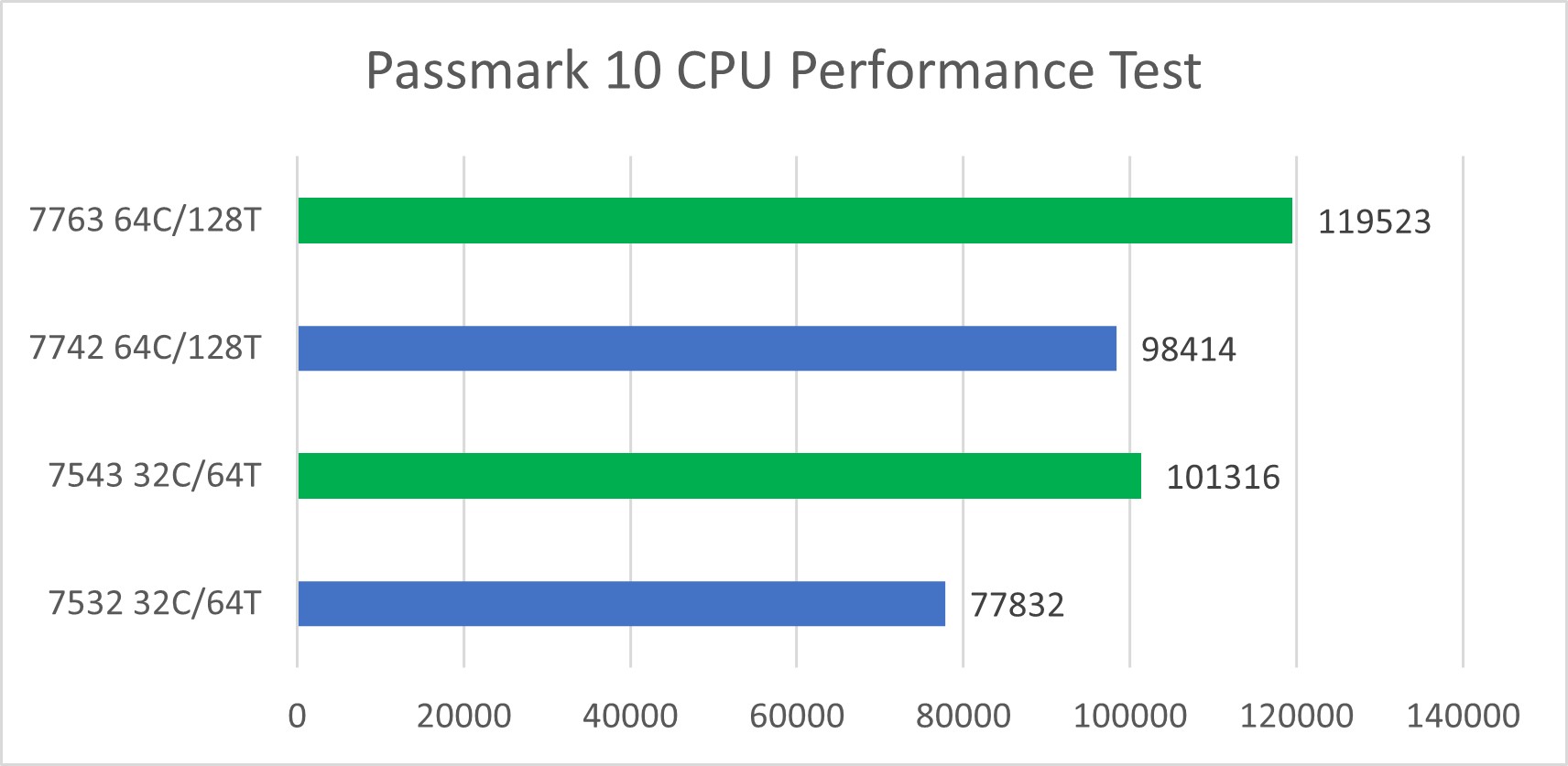 The PassMark CPU benchmark performs a wide variety of calculations. The benchmark score is then based on how fast the CPU can perform the complex series of instructions. The faster the processor is able to complete the tasks, the higher the benchmark score. The tests are based on several tasks such as mathematical, compression, encryption, physics, multithreaded and single threaded. The pattern continues with the 7763 scoring around 20% higher than its predecessor. There is a 30% improvement in the 32 core. These CPUs are clearly all around better for performing a wide variety of computational tasks and workloads.
