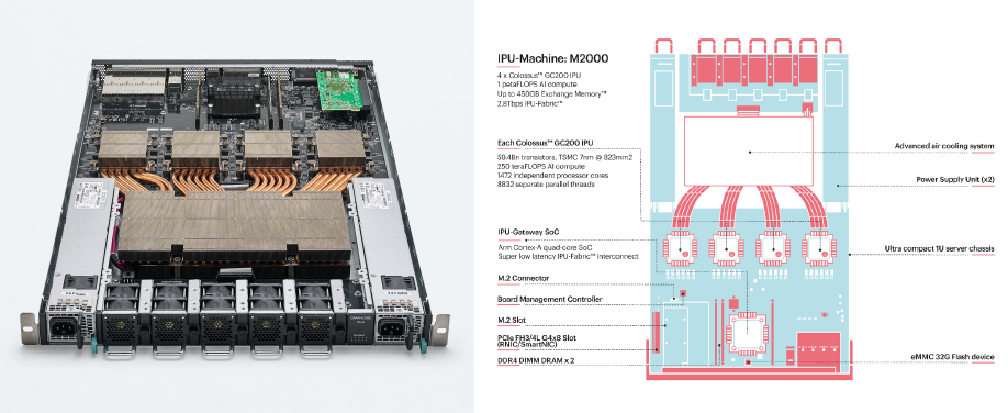 Each colossus GC200 IPU contains; 59.4Bn transistors, 250 teraFLOPS AI compute, 1472 independent processor cores, and 8832 separate parallel threads.