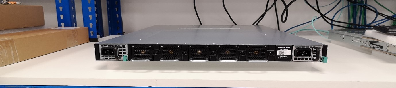 The IPU-M2000 back panel contains 2 power connectors per IPU-M2000, 5 Fan units (n+1 redundant and removable) and a Unit QR code.