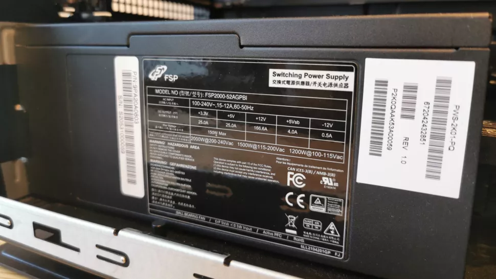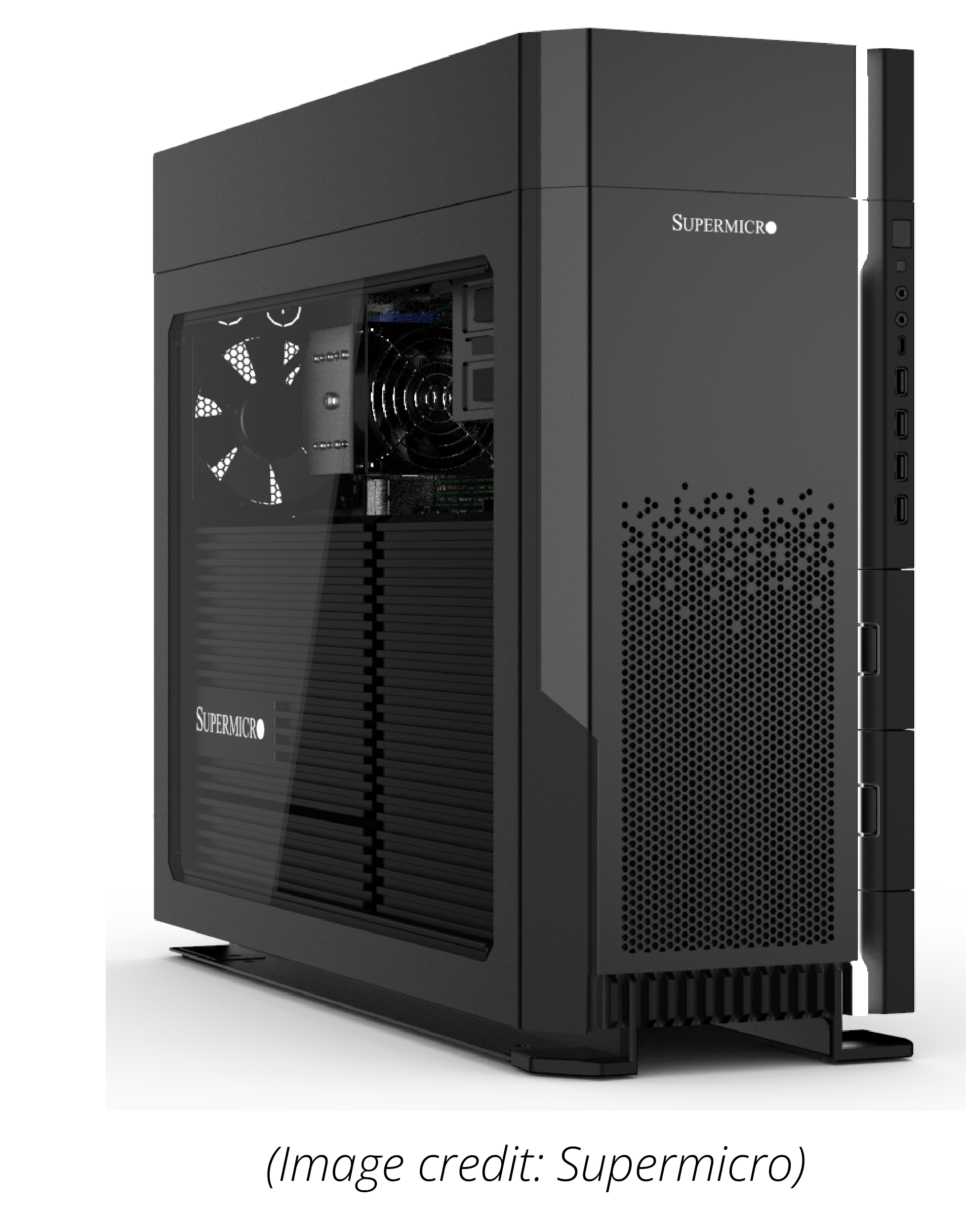 What can fit inside is the Supermicro Super M12SWA-TF E-ATX motherboard, a 2000w PSU, a full-length Nvidia Ampere-class video card, up to sixteen modules of DDR4 ECC memory, and six PCIe 4.0 x16 slots.