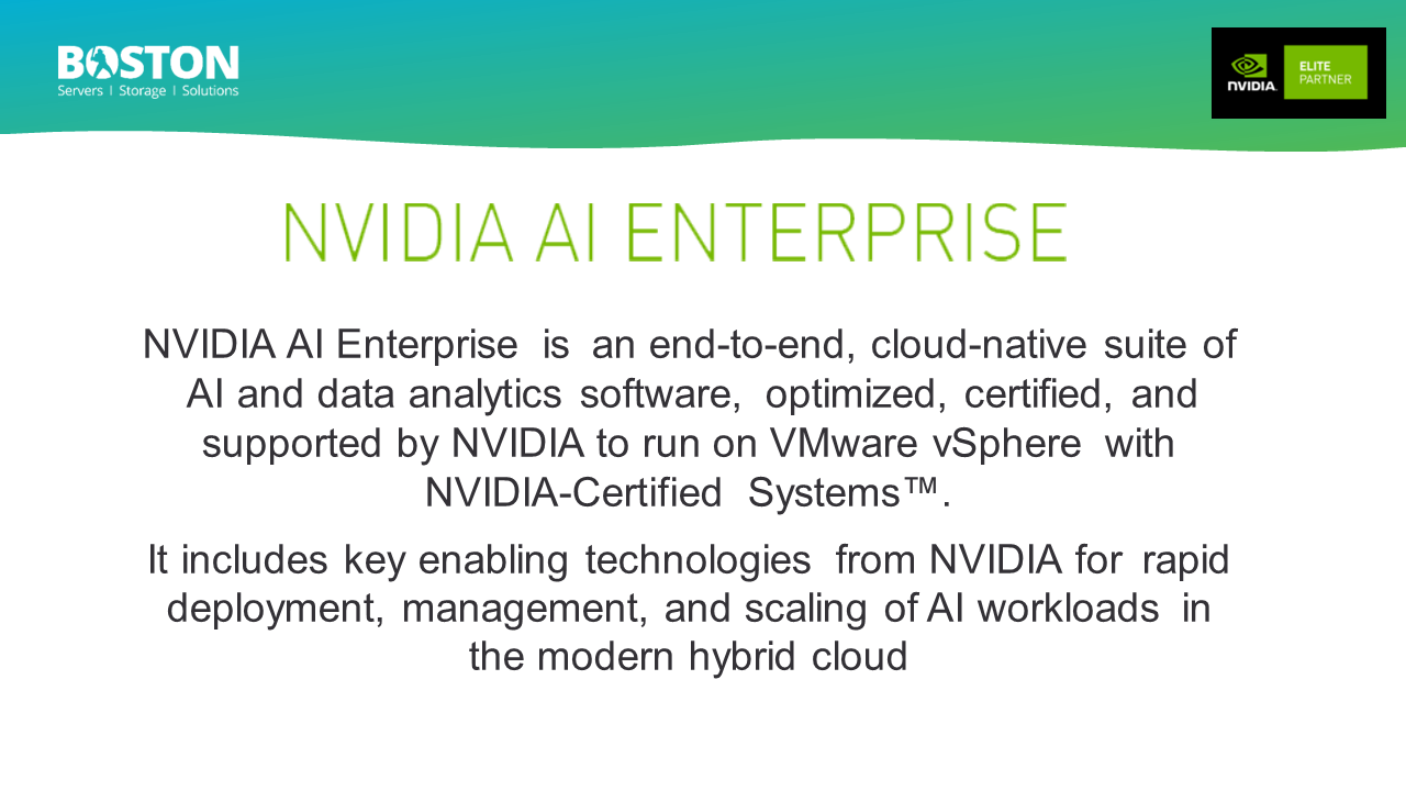 Here at Boston, being an NVIDIA Elite Partner, we offer our own NVIDIA Certified AI Enterprise solutions for various applications, from entry level through to enterprise level with scaling options.