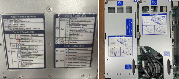 It's great to see guide stickers on the chassis lid that assist in understanding the meaning of various LED functions. Additionally, stickers on riser brackets explain the process of installing or removing expansion cards. These features make Supermicro servers even more user-friendly, which will be appreciated by hardware engineers who work with them, as well as third-party on-site engineers who may not be fully familiar with the servers and need to make a repair.