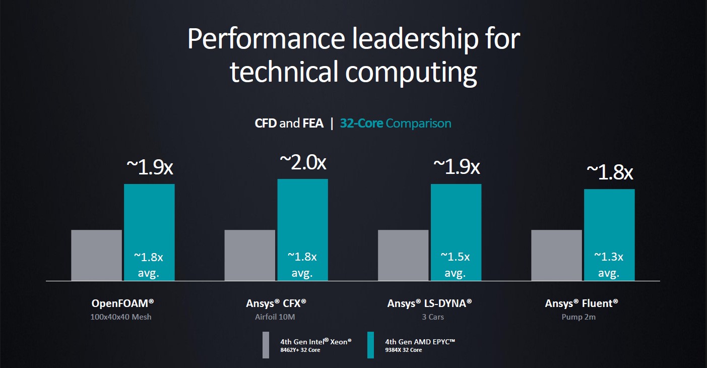 These CPU’s complement the original EPYC Genoa SKU’s by offering up to a huge 1152MB L3 cache. Designed for the HPC market; applications which require faster access to memory. Having this huge cache directly on the CPU die means faster access vs when an application otherwise would have to use standard RAM. And, of course, the cache memory being on the CPU die means it is much faster too.