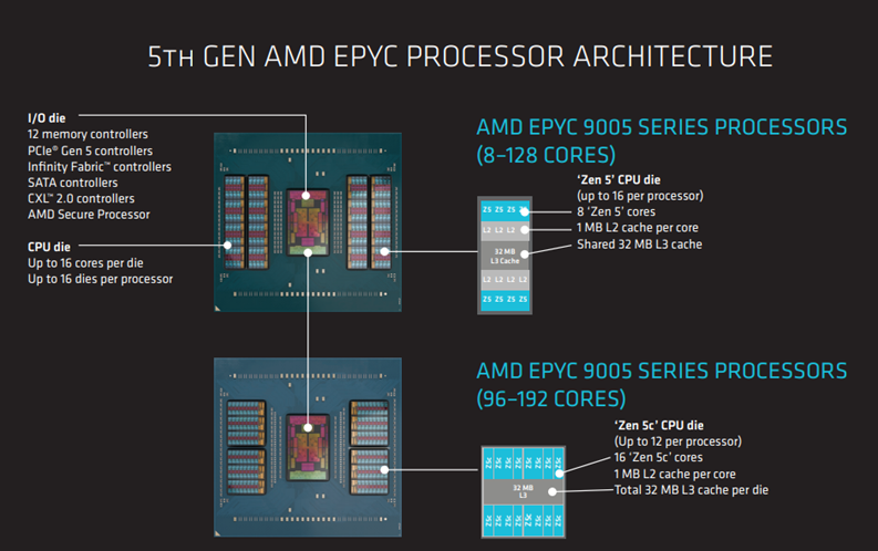 AMD’s 5th Gen EPYC processors feature two core types to optimise performance and efficiency: the Zen 5 core, designed for single-threaded, latency-sensitive workloads like enterprise databases, offers up to 128 cores with 8 cores per CCX and 32MB shared L3 cache, supporting up to 16 CCDs in the SP5 socket. In contrast, the Zen 5c core, tailored for high-density, multi-core applications such as AI training and HPC simulations, provides up to 192 cores with 16 cores per CCX, also with 32MB shared L3 cache, and up to 12 CCDs in the SP5 socket, leveraging a compact layout for maximum performance per watt.