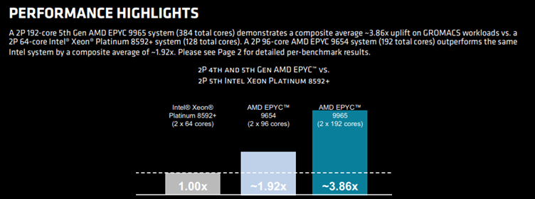 Based on the test results from our lab, the 5th-generation EPYC CPU performs exceptionally well across a wide range of application performance benchmarks.