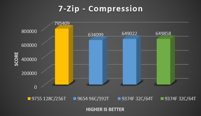 This benchmark assesses data compression performance, rated in MIPS (millions of instructions per second). As the graphs demonstrate, the EPYC 9755 provides enhanced performance in these workloads.