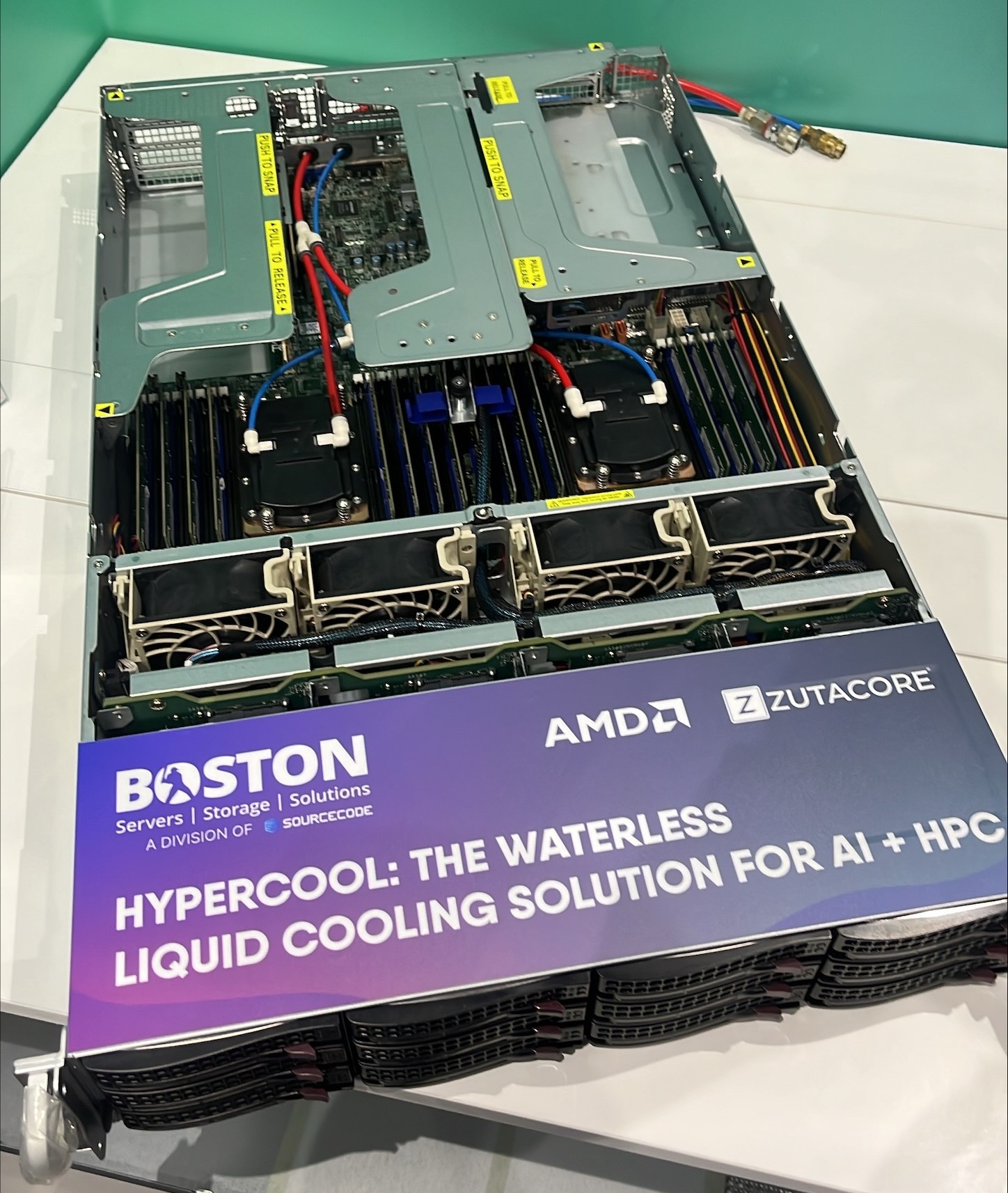 At the Boston booth, the focus was on more than just infrastructure — it was on what that infrastructure enables. In partnership with Supermicro, we showcased the AMD H12 2U Ultra featuring ZutaCore’s direct-to-chip liquid cooling. Designed for high-density deployments, this system delivers superior thermal performance in space-constrained environments, making it ideal for the hot climates and energy challenges often found across African data centres.