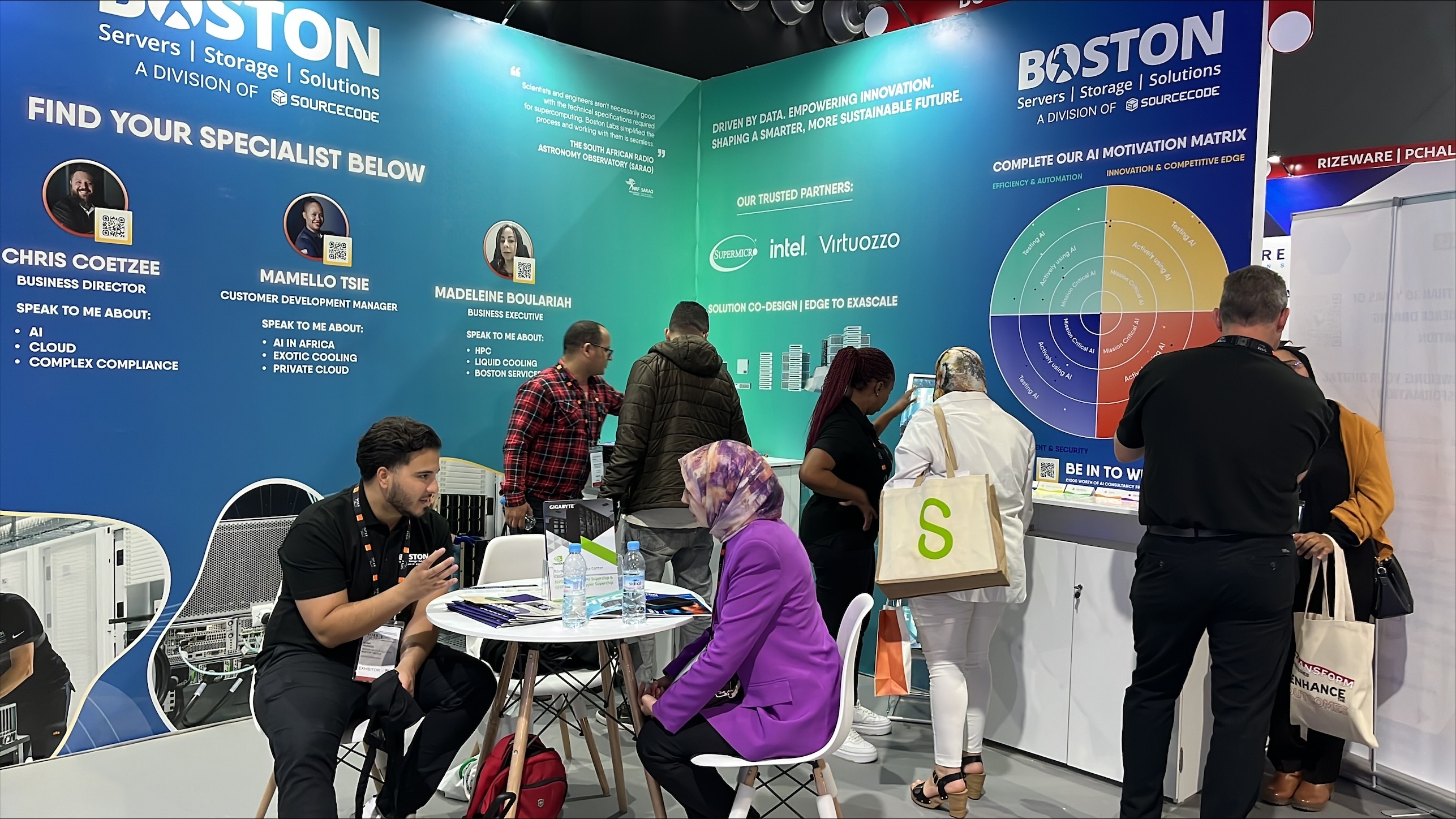 Live discussions at the booth covered a broad range of topics — from HPC-as-a-Service and GPU clusters, to how liquid cooling and containerised applications can accelerate performance in remote edge deployments. Africa’s climate, infrastructure landscape and emerging AI ambitions present a complex mix of challenges and opportunities — and Boston’s strength lies in building the right solution for each context. The team held technical workshops, fielded integration discussions and explored new alliances that could shape deployments across the region in the months to come.