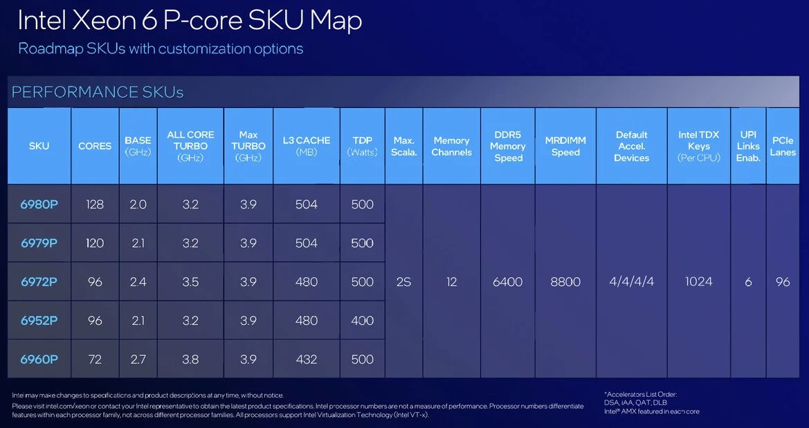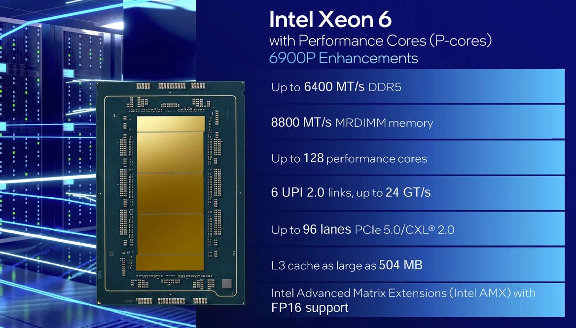 The Intel Xeon 6900P (Granite Rapids-AP) supports 1 or 2 socket configurations and especially fit for the demanding high-performance computing (HPC) and AI workloads. The Xeon 6 6900P series features an all-P-core design with up to 128 cores per socket. It supports 12-channels of DDR5-6400 or 8800MT/s MRDIMM/ MCR DIMM memory. There are 96 lanes of PCIe Gen5 per CPU for 192 lanes total, and there is CXL 2.0 support, all while enabling a full 6 UPI lanes for socket-to-socket bandwidth. Intel Xeon 6980P has 504MB of L3 cache.