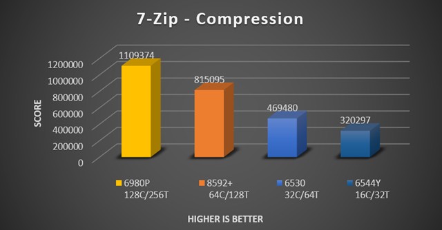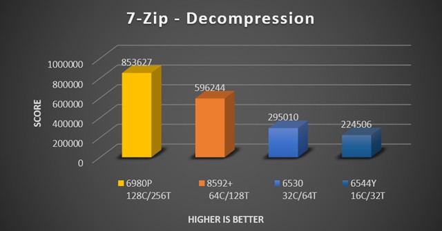 In the 7-Zip test, which benchmarks data compression and decompression performance in MIPS (Million Instructions Per Second), the Xeon 6 6980P scored 853627 points, while the Xeon 8592+ achieved 596244. This reflects over a 30% performance improvement for the Xeon 6 6980P in these workloads, largely due to its significantly higher core count. The results also show nearly a 3x performance gain for the Xeon 6 6530 and 6544Y CPUs, further demonstrating the substantial efficiency and throughput improvements offered by the Xeon 6 architecture.