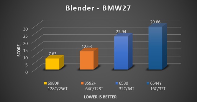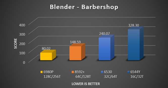 The Xeon 6 6980P, with its 128 cores and 256 threads per socket, delivers leading 3D rendering performance in Blender tests. By supporting branched path tracing, the Xeon 6 6980P achieves outstanding results in both Blender benchmark tests. It completes the BMW 27 rendering in just 7.63 seconds and the complex interior rendering in the Barbershop test in 80.02 seconds. These results demonstrate an impressive performance gain of over 40% in both the BMW 27 and Barbershop tests compared to 8592+ CPU.