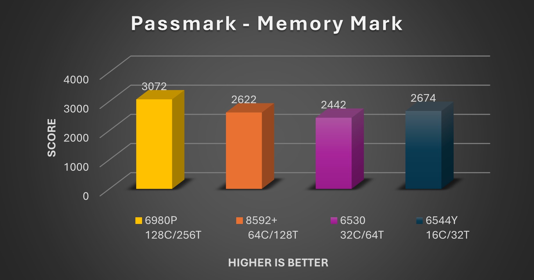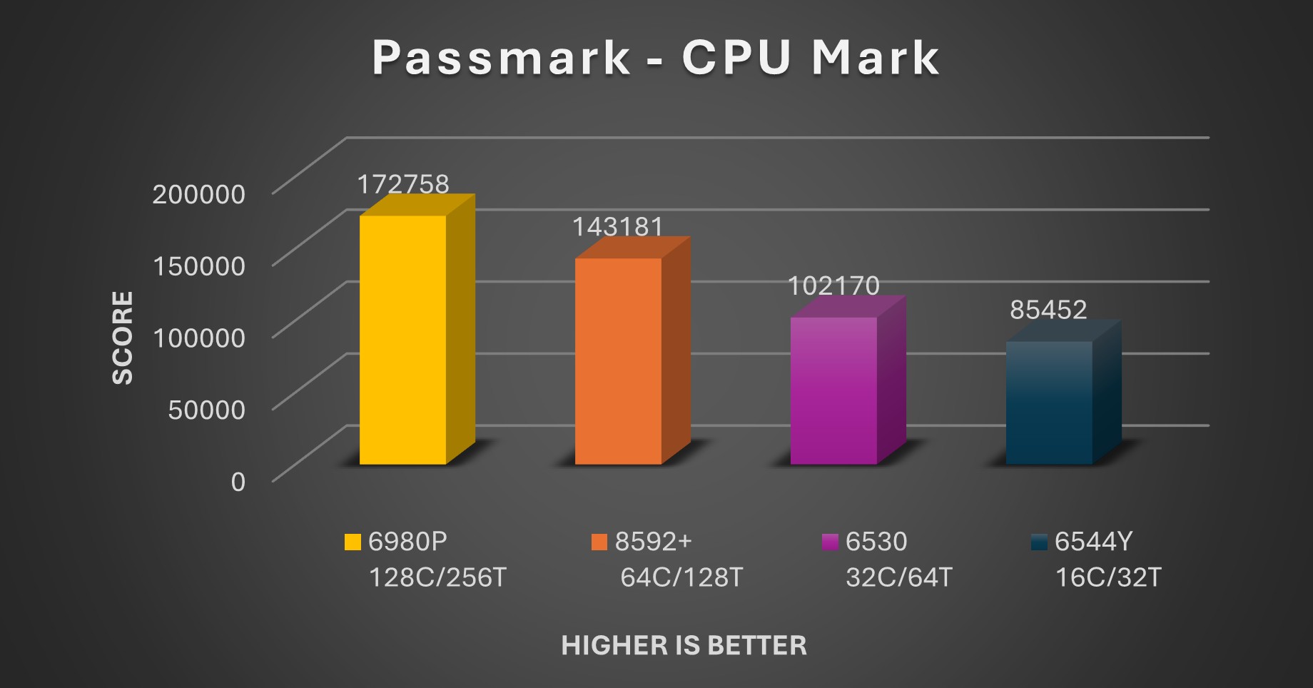 The PassMark CPU benchmark performs a wide variety of calculations. The benchmark score is based on how quickly the CPU can execute a complex series of instructions. The faster the processor completes the tasks, the higher the benchmark score. The tests cover several tasks, including mathematical operations, compression, encryption, physics and both multithreaded and single-threaded workloads. In these tests, the Xeon 6 6980P scored 172758, while the Xeon 8592+ scored 143181, showing a notable performance gain of around 20% compared to the 8592+. The 6980P continues to demonstrate impressive results when compared with the 5th generation SKUs, clearly proving to be superior for handling a wide range of computational tasks and workloads.
