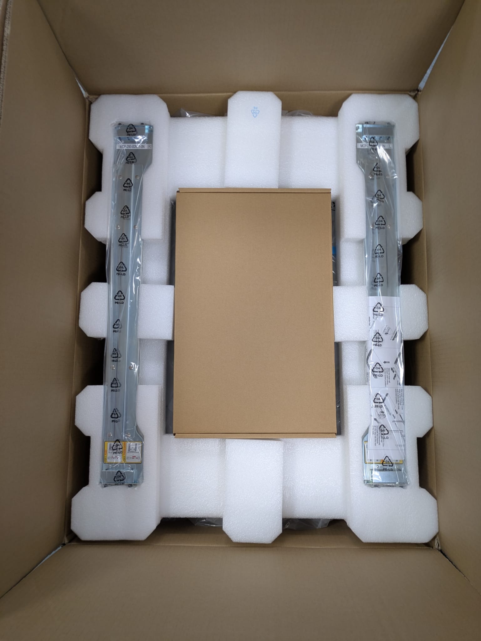 The server presents itself with an efficient layout. It is carefully encased in protective foam and wrapped in anti-static plastic, safeguarding it from both physical impact and static discharge. The rails and accessory box are neatly packed around it and are ready for deployment.