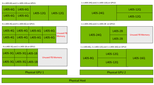 Nvidia’s vGPU technology allows you to split the GPUs vRAM into pieces and separately allocate these to individual VMs. They would allow you to take Nvidia’s RTX PRO 6000 series GPU and slice it into 12, giving each VM 8GB of vRAM/framebuffer whilst sharing the full compute power between all guest VMs. As mentioned, in recent versions you no longer need all profiles to be the same, allowing you to co-locate low-demand 2/4GB profiles alongside a more demanding 16GB profile. This can optimise the utilisation levels of vRAM and compute capacity of each card.