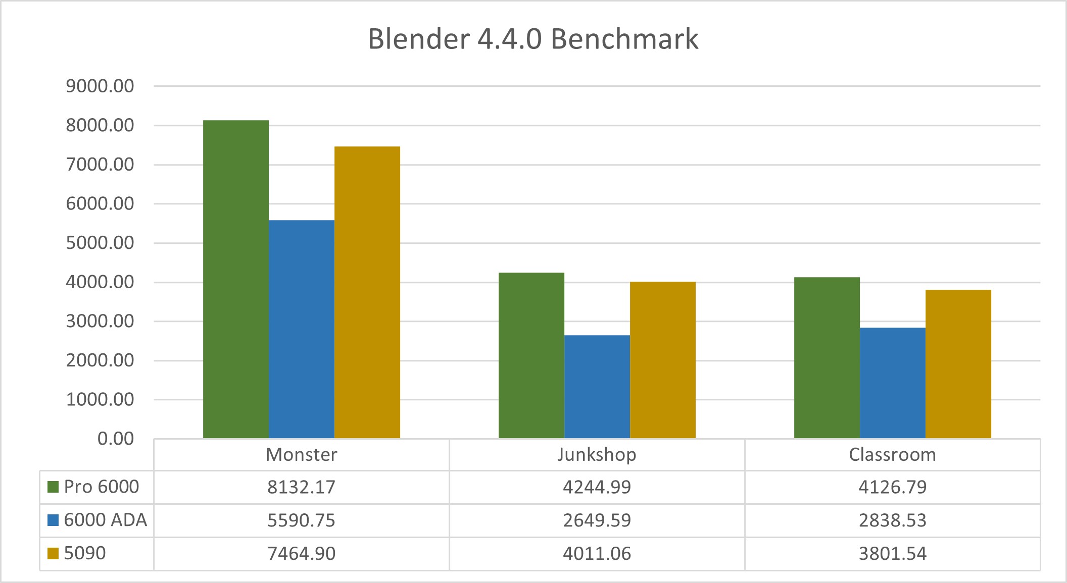 The NVIDIA RTX Pro 6000 consistently outperformed both the RTX 6000 ADA and the GeForce RTX 5090 across all test scenes. In the Monster scene, it delivered over 45% better performance than the RTX 6000 ADA and nearly 9% better than the RTX 5090. In the Junkshop scene, the Pro 6000 extended its lead with more than a 60% improvement over the RTX 6000 ADA and just under 6% over the RTX 5090. The Classroom scene showed similar results, with the Pro 6000 outperforming the RTX 6000 ADA by about 45% and the RTX 5090 by approximately 8.5%.