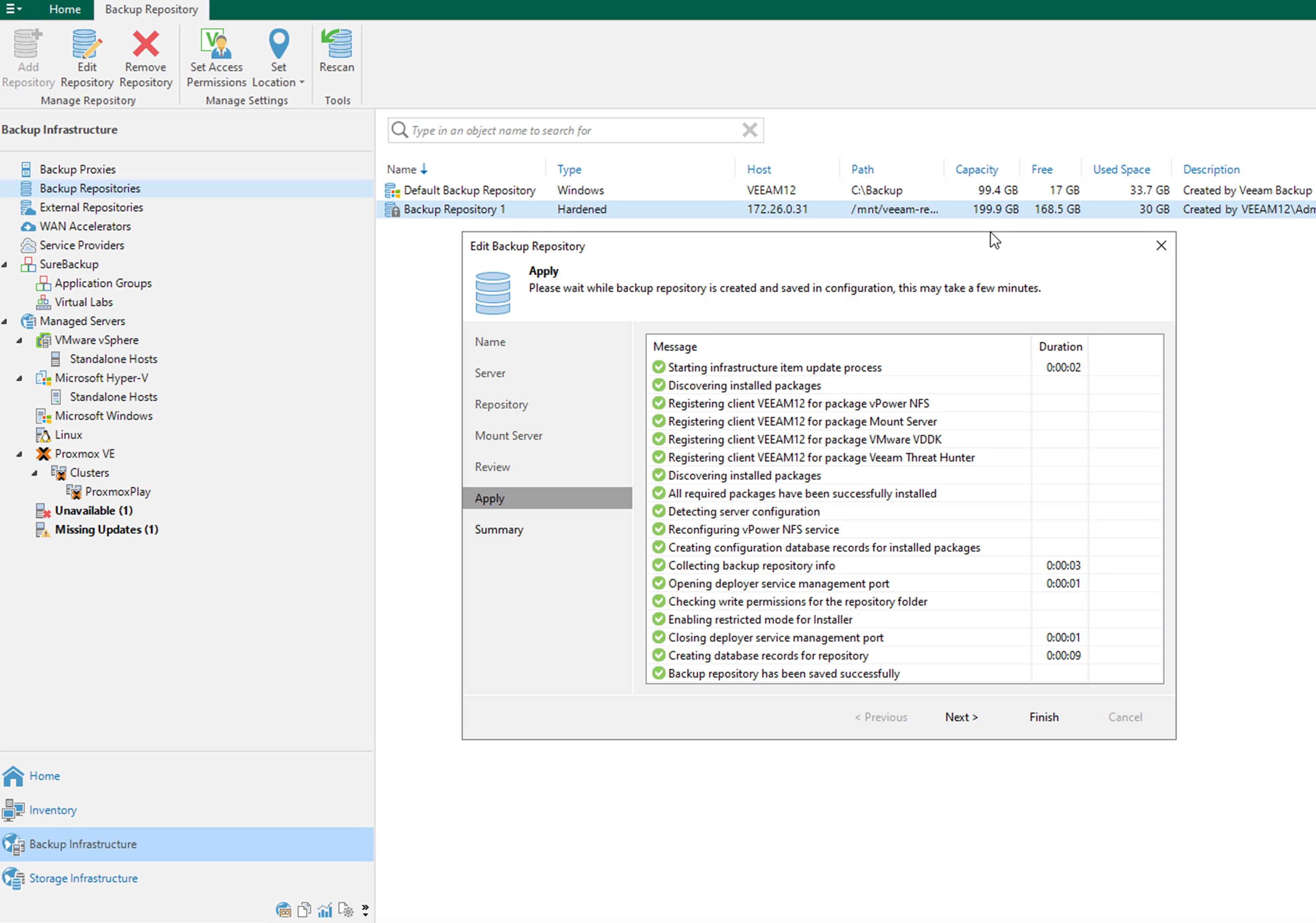 The management of the Hardened Repository in Veeam Backup & Replication console.