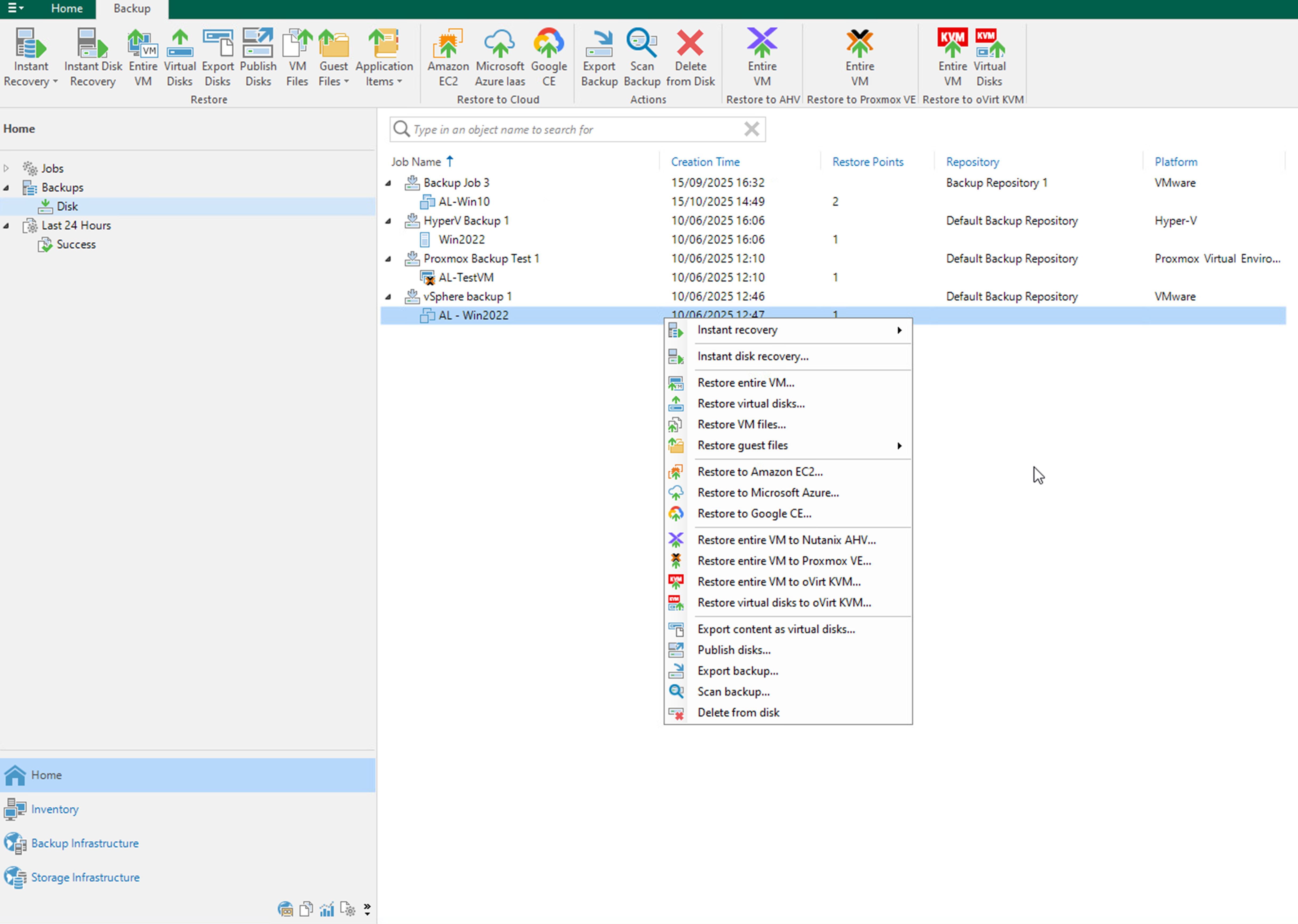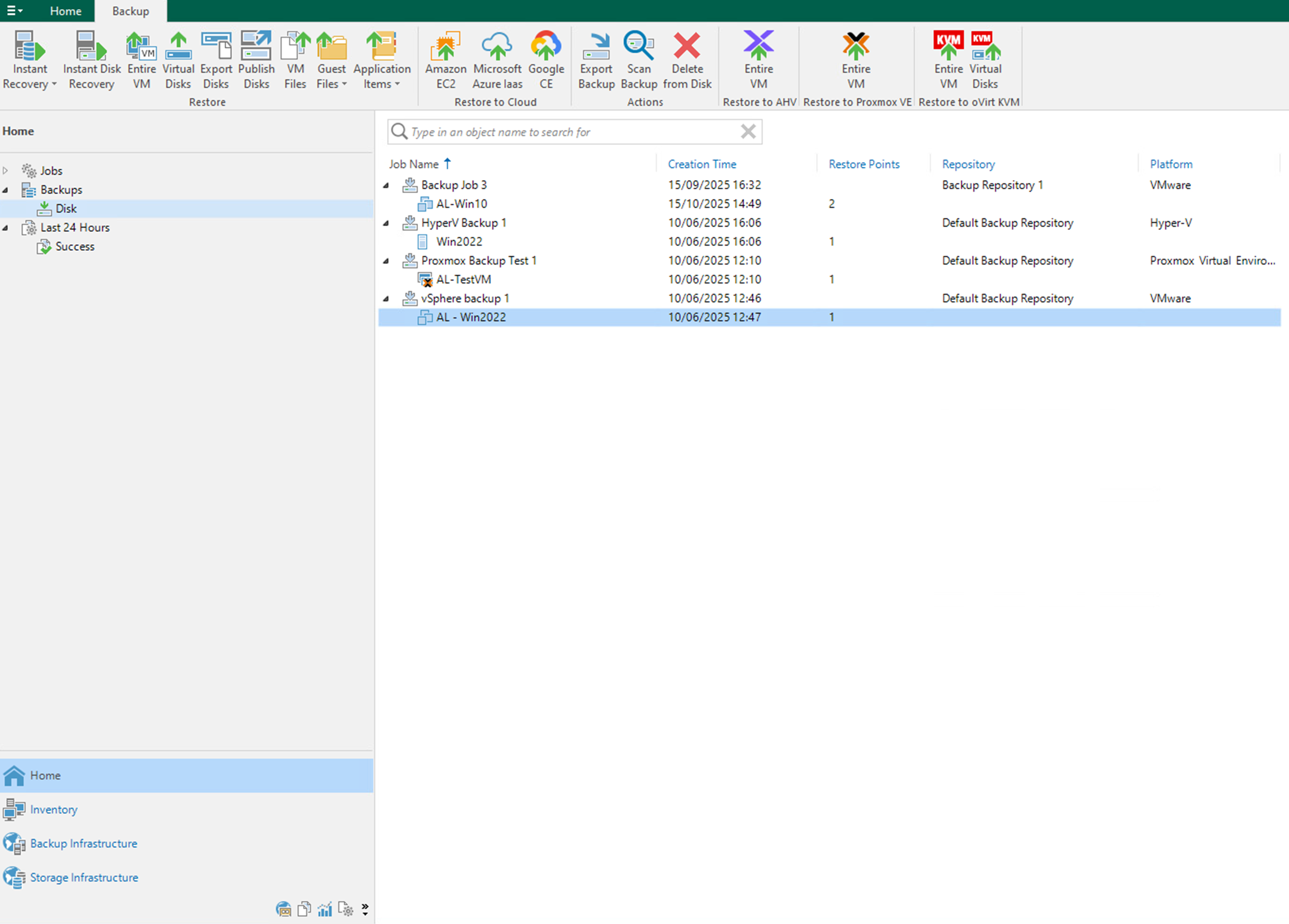 The below shows the Veeam Backup Server connecting to VMware vSphere platform and Proxmox VE virtualisation platform with backup policies defined.